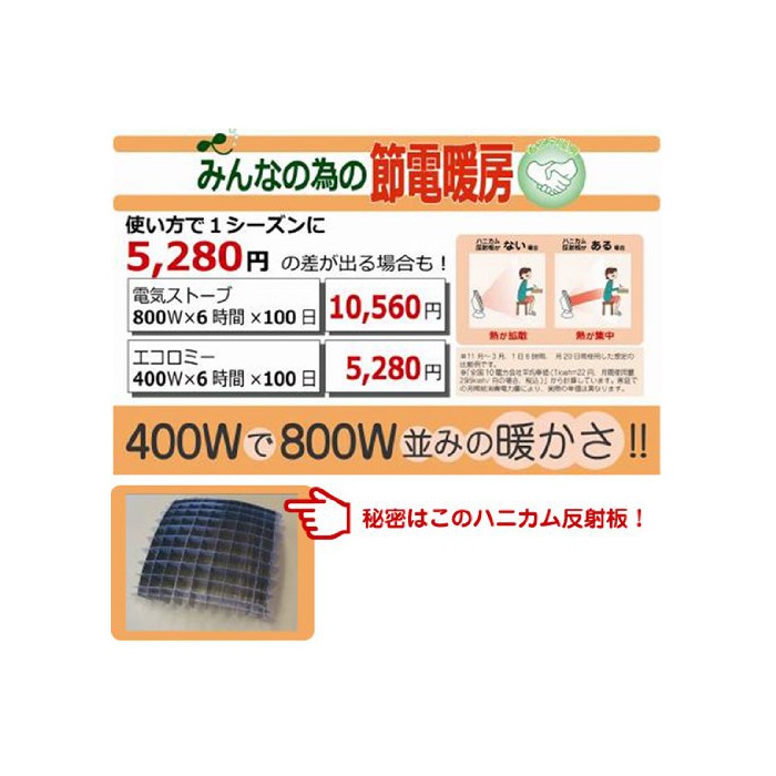 이렇게 작은데,400W에 800W같은 수준의 따뜻함을 실나타낸 것은,내부에 끼워 팽이진 honeycomb 반사 판에 비밀을 있습니다.honeycomb 반사 판은,히터부터 나오는 열을 볼록 렌즈와 같이 전방으로 집중해 열을 방사 하므로,차가와지기 쉬운 발밑 등의 국소 난방에 딱.에코로미3은,종래의 반의 전력에서도 동등의 따뜻함을 얻어지는 때문에,절전으로도 활약합니다!