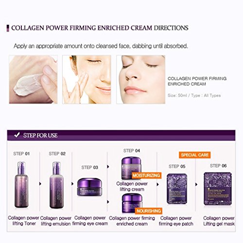 -. Feature : Rich collagen gives a superior skin firming effect while delivering deep hydration. / Improves skin elasticity & Longlasting skin moisturizing : Copper tree Peptide-1, and palmitoyl pentapeptide-4 regenerate damaged skin tissues, creating a synergy effects of skin firming with 54% of Collaen and hyaluronic acid. Olive oil, Camellia flower oil and evening P.R.Imrose oil leave skin moisturized all day long. / Wrinkle care : Adenosine helps to improve skin elasticity effectively. / Elastic texture : The elastic cream absorbs easily. / No Paraben, Ethanol, Benzophenone, artificial coloring, or artificial frgrance contained