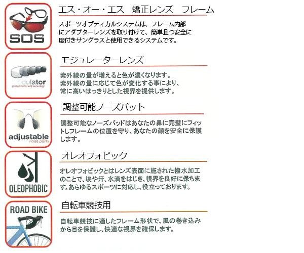 | 仕様 | UVカット率:99% 可視光線透過率:76~20% エス・オー・エス矯正レンズフレーム モジュレーターレンズ 調整可能ノーズパッド オレオフォビック(撥水加工) 自転車競技用 |