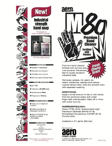 -. Binding : Health and Beauty -. Brand : Aero Care -. Color : Red -. EAN : 0042283576711 -. Feature : * NOT AVAILABLE IN CALIFORNIA due to Regulations * ONLY available in the Continental US * / Selling unit is: 4 - 1 Gallon Bottles per case / FITS Zep Dispensers. Compare M-80 to Zep's Cherry Bomb / Excellent degreaser. Fortified with pumice - Cherry Fragrance / May be used w/dispensers -. Label : ABC Compounding Co. -. Manufacturer : ABC Compounding Co. -. Model : 6597F1SAN -. MPN : 6597F1SAN -. PackageQuantity : 4 -. PartNumber : 6597F1SAN -. ProductGroup : Health and Beauty -. ProductTypeName : HEALTH_PERSONAL_CARE -. Publisher : ABC Compounding Co. -. Studio : ABC Compounding Co. -. Title : M-80 Industrial Strength Hand Soap/Premium Hand Cleaner Fortified with PUMICE - Sold by case only; 4 - 1 Gallon Flat Top Containers in each case -. UPC : 042283576711