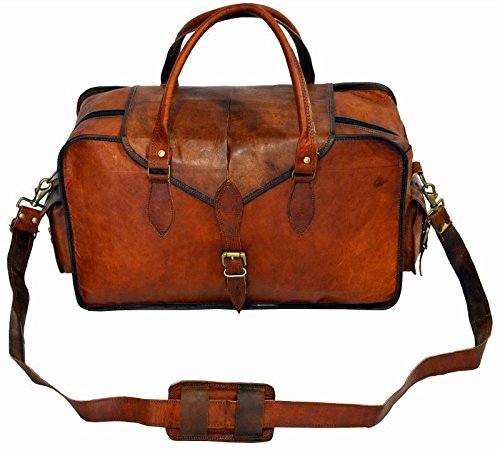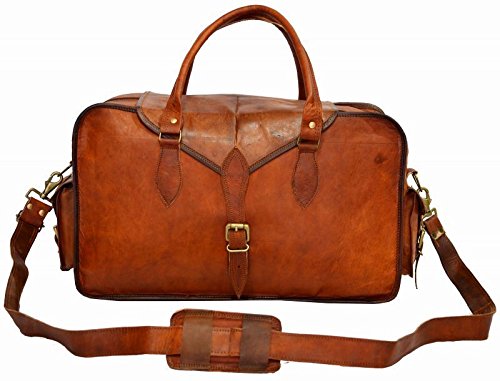 -. Brand : SatchelandFable -. Color : DARK BROWN -. Department : mens -. Feature : Material- Full grain Goat hide Size- 20"(L), 11"(H), 08"(D) / 1 cross body removable shoulder belt. Handles on top to carry. / Outside both side pockets. Flap covered from top. / Real Brass metal accessories used in this Bag. Made by professional and experienced artisans from Rajasthan / Natural leather smell will go away within few days from the usage of this bag. Eco friendly and weather resistant. -. Model : S&F1 -. PackageQuantity : 1 -. ProductGroup : Apparel -. ProductTypeName : LAGE -. Size : medium -. Title : Men's Genuine Leather Vintage Duffle Gym Large Travel Weekend Lage Bag …