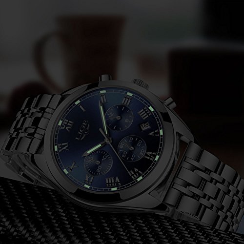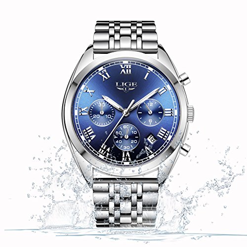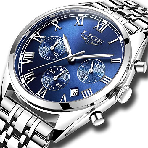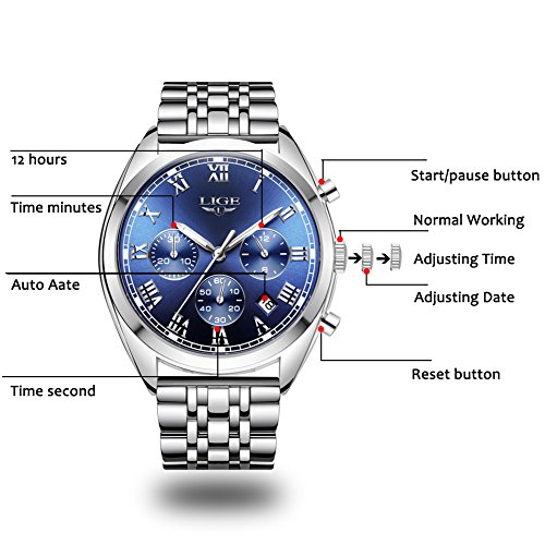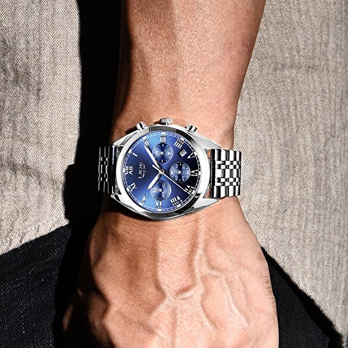 ☼ multi-function: mens stainless steel watches have a big round silver blue display dial with luminous hour mark and hour/minute hands, auto date and 3 functional sub-dials for chronograph second,chronograph minute and 12 hours