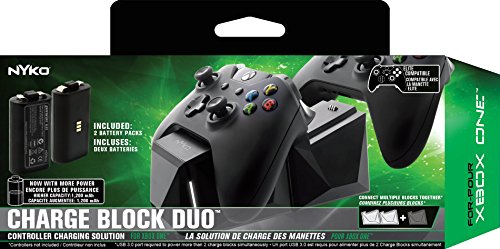 -. Binding : Video Game -. Brand : Nyko -. EAN : 0743840861317 -. Feature : Unique design allows for easy, one handed use / Include two Charge Blocks and two 1,200mAh batteries. / Connect multiple Charge Blocks together from different platforms / Power cable for the block can disconnect to charge the controller separately / Plugs into any wall outlet or USB port for rapid recharging -. HardwarePlatform : xbox_one -. IsAdultProduct : 0 -. Label : Nyko -. Manufacturer : Nyko -. Model : 86131 -. MPN : 86131 -. OperatingSystem : Xbox One -. PackageQuantity : 1 -. PartNumber : 86131 -. Platform : Xbox One -. ProductGroup : Video Games -. ProductTypeName : VIDEO_GAME_ACCESSORIES -. Publisher : Nyko -. ReleaseDate : 2016-12-31 -. Studio : Nyko -. Title : Nyko Charge Block Duo - Xbox One -. UPC : 743840861317
