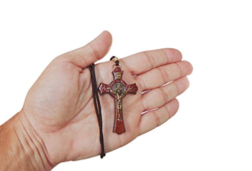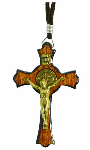 -. Title : St. Benedict Wooden Gold Tone Cross Crucifix Pendant Necklace - 2.56" Cross
