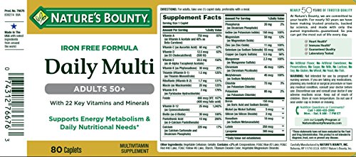 Product DescriptionNature's Bounty Iron Free Formula Daily Multi provides adults 50 with 22 key vitamins and minerals, supporting energy metabolism and daily nutritional needs.0