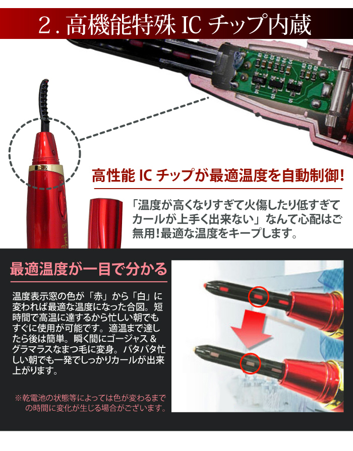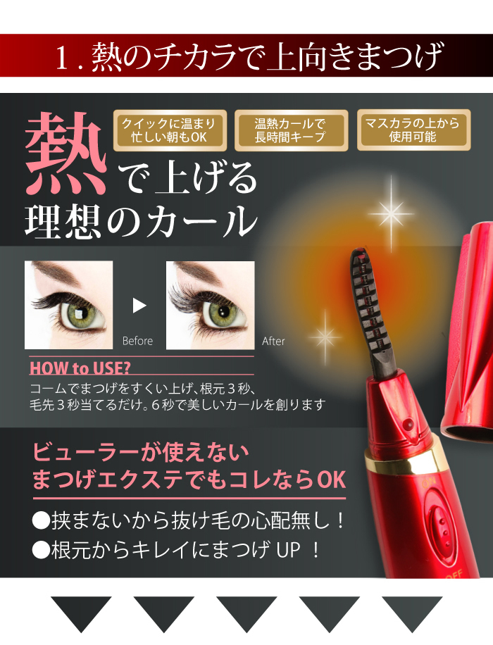 使用上の注意・目を傷つけないよう鏡でよく確認しながら使用して下さい。また、慣れるまではスイッチをOFFの状態で、動かし方をマスターして下さい。