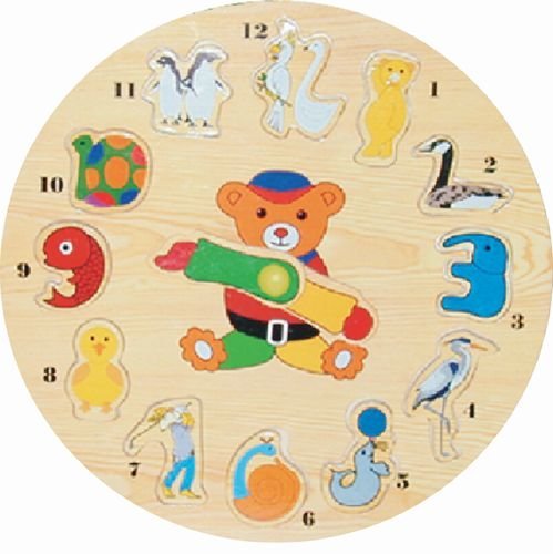 4601 - Animals Wooden clock - Our animals clock raised puzzle is a fun colorful educational puzzle that will introduce your kids to numbers and will help teach them to tell time. This wooden clock puzzle is designed for age 3+, and is also perfect for travel. This carefully crafted product is brought to you by Puzzled Inc.Feature