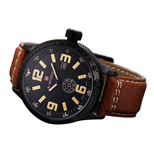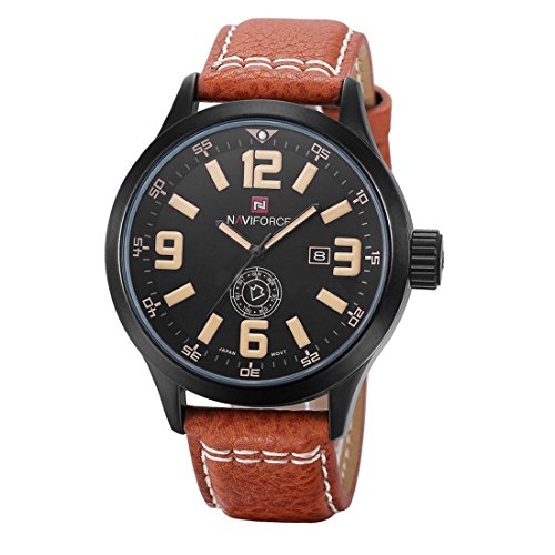 -. Binding : Watch -. Brand : NAVIFORCE -. Color : Black -. Department : men -. EAN : 0190268347174 -. Feature : Date display at 3 o'clock. / Everlasting low-key luxury style. / Simple watch dial plate with big hour marker. / Soft leather watch band, which is comfortable for daily wear. / Do not worry about water, this wristwatch is 3ATM daily life water resistant (but not for showering, swimming and diving). -. Label : NAVIFORCE -. Manufacturer : NAVIFORCE -. MPN : 068296 -. PartNumber : 068296 -. ProductGroup : Watch -. ProductTypeName : WATCH -. Publisher : NAVIFORCE -. Studio : NAVIFORCE -. Title : Quartz Wrist Watch - NAVIFORCE Black Dial Outdoor Sports Date Quartz Wrist Watch Mens (Yellow) -. UPC : 190268347174