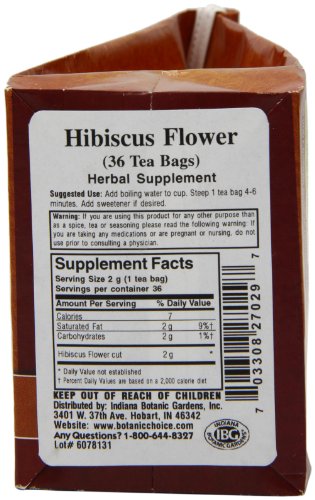 -. Binding : Health and Beauty -. Brand : Botanic Choice -. EAN : 0703308270297 -. Feature : Native to temperate and tropical regions, hibiscus was important to both Indian and Chinese cultures. / A time tested classic favorite! / Add boiling water to cup. Steep 1 tea bag 4-6minutes. Add sweetener if desired. / 100% Money Back Guarantee. We are so confident you will love our time tested herbal supplements, we back it with a full year money back guarantee, hassle free. -. Label : Botanic Choice -. Manufacturer : Botanic Choice -. NumberOfItems : 6 -. PackageQuantity : 6 -. ProductGroup : Health and Beauty -. ProductTypeName : HEALTH_PERSONAL_CARE -. Publisher : Botanic Choice -. ReleaseDate : 2008-06-03 -. Studio : Botanic Choice -. Title : Botanic Choice Hibiscus Flower, 36 Tea Bags (Pack of 6) -. UPC : 703308270297