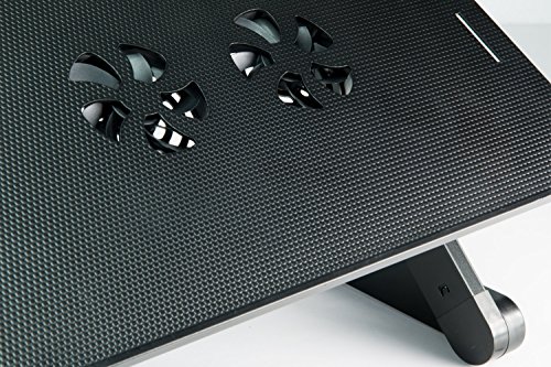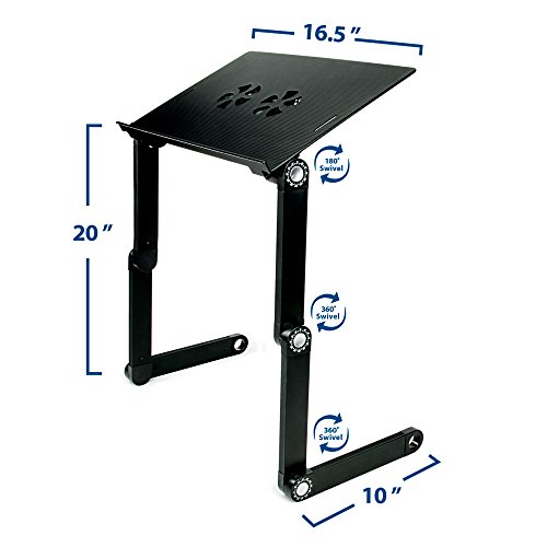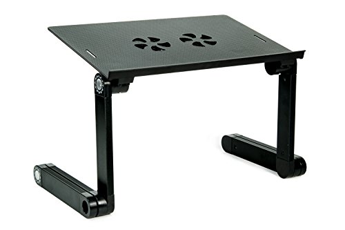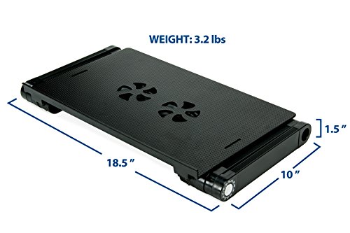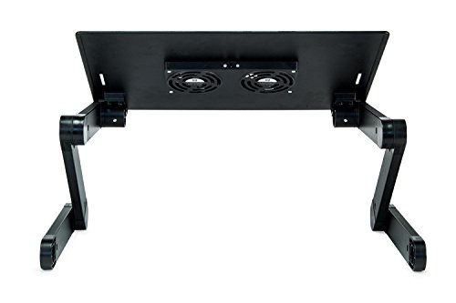 -. Feature : MULTIPLE USES - This laptop stand is extremely versatile, and can be used for many things other than just your laptop. After you are finished working on your laptop, transform this computer lap stand into a food tray, a reading table, or a drawing area! / COOLING FANS - Laptops tend to get warm when they are being used for long periods of time. Instead of just having vent holes in the tray, this laptop table stand features two cooling fans that are powered through USB ports to dissipate the warm air from under your laptop. Enjoy many hours of computer use without worrying that your laptop may overheat. / FULLY ADJUSTABLE - Say goodbye to the days where you strain your neck to view your laptop! This adjustable desk for laptops gives you the ability to create a comfortable and ergonomic working position. You can make the stand more compact if you are lying in bed, and extend it further if you decide to use it as a laptop stand desk. / LIGHTWEIGHT AND PORTABLE - If you find that you travel often with a laptop, you will enjoy the fact that this ergonomic laptop stand is compact, lightweight, and portable. This stand is very slim when collapsed, and only weighs 3.2 pounds! Don't let the lightweight design fool you, this laptop stand is made with sturdy aluminum alloy ensuring that your laptop will be secure when in use. / NO ASSEMBLY REQUIRED - Enjoy using this bed laptop tray straight out of the box since you don't need to bother with the assembly! Experiment with the different ways that you can use this stand, and feel more comfortable while you work, read, eat, or draw.