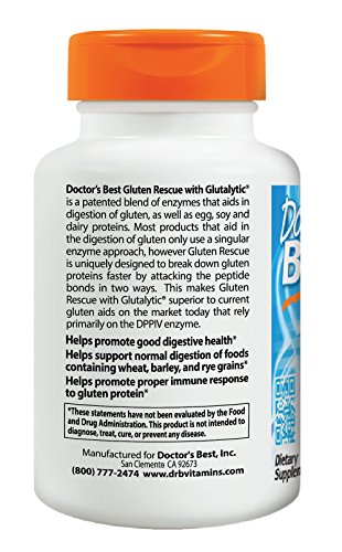 Doctor's Best Gluten Rescue with Glutalytic is a patented blend of enzymes that aids in the digestion of gluten, as well as egg, soy and dairy proteins