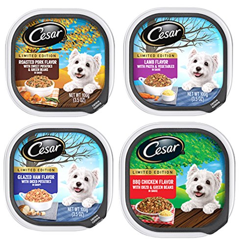 Treat your dog to Cesar Limited Edition dog food. Contains 2 tubs each of Glazed Ham Flavor with Diced Potatoes in Gravy, BBQ Chicken Flavor with Orzo and Green Beans, Lamb Flavor with Pasta & Vegetables, and Roasted Pork Flavor with Sweet Potatoes and Green Beans.