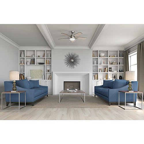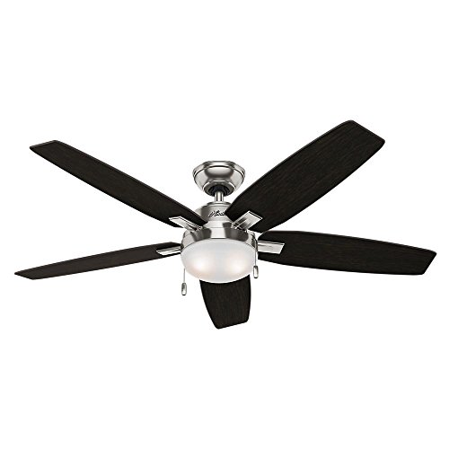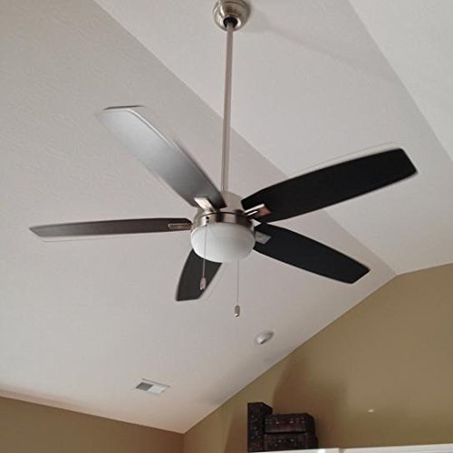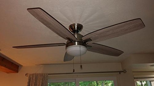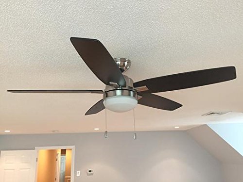 Specifications Dimensions Assembled Depth (in.): 54.00 in Assembled Height (in.): 14.53 in Assembled Width (in.): 54.00 in Ceiling Fan Width (in.): 54 Downrod Length (in.): 3 Fan Blade Length (In.): 22 Fan Blade Width (In.): 4.5 Details Airflow (CFM): 3503 Blade Color Family: Oak,Walnut Bulb wattage (watts): 9.8 Color Family: Nickel Commercial / Residential: Residential Damp/Wet Rating: Dry Downrod Included: Yes Dual Fan Heads: No Fan Blade Material: Medium Density Fiberboard (MDF) Features: Reversible Blades,Reversible Motor Fixture Color/Finish: Brushed Nickel Glass Style: Contemporary Housing Color Family: Nickel Included: Angle Mount Hardware,Downrod Included,Hardware Included,Light Kit Included Indoor/Outdoor: Indoor Light Bulb Type Included: LED Light Type: Integrated Motor Speed (RPM): 192 Mounting Options: Angled,Low Ceiling Mounting,Standard Number of Blades: 5 Number of Speeds: 3 Product Weight (lb.): 24.25lb Pull Chain: Yes Remote Control: No Reverse Airflow: Yes Reversible Two-Sided Blades: Yes Timer: No Certifications and Listings: ETL ListedFeature