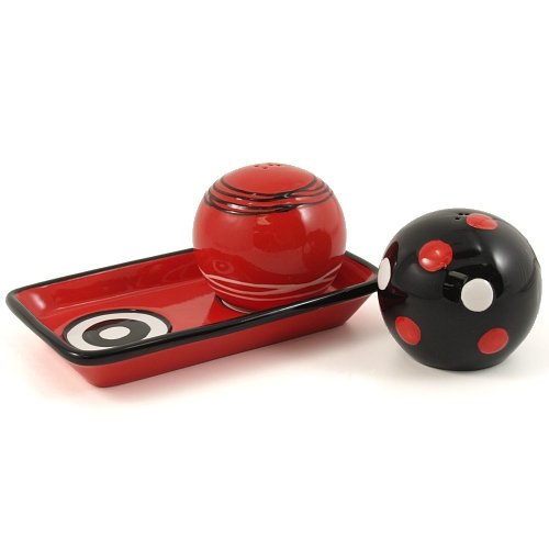 Round Ball Red Swirl Salt & Pepper Shaker Set with Tray