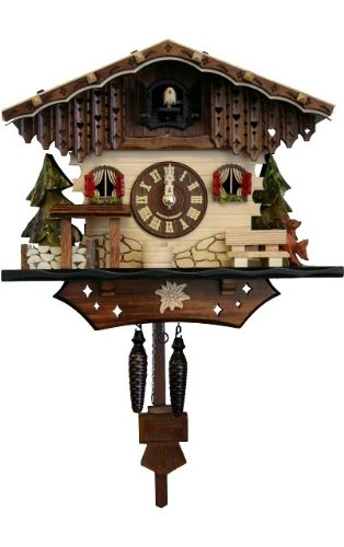 Studio : Alexander Taron Inc Publisher : Alexander Taron Inc Binding : Kitchen Product Description Even if you don't care for Lederhosen and bratwurst, you'll love this German-made Black Forest 8.5-Inch High Cuckoo Clock. The cabin-in-the-woods design is a reminder of classic German architecture. Just like any good cuckoo clock, it cuckoos on the hour, every hour, for the number of hours. A moving water wheel and chopping wood add to the atmosphere. This clock will play 12 sweet tunes when the little bird pops out to remind you of the time. Best of all, there's an off switch for when you're having quiet time. For more than half a century, the Taron Company has been delighting customers and collectors with traditional European gifts. These exquisite hand-crafted products range from nutcrackers and incense burners to ornaments and cuckoo clocks; unique and collectible, they make unforgettable gifts regardless the occasion. Originally founded in 1949, Alexander Taron remains dedicated to providing high-quality items at great value. Ornate, battery-powered cuckoo clock. Cuckoos number of hours on the hour. Designed in a traditional German cabin style. Plays 12 tunes. On/off switch for cuckoo music Uses 3 C batteries (not included). Moving water wheel and wood chopper. Dimensions 8.5W x 8.5D x 10H in. 0
