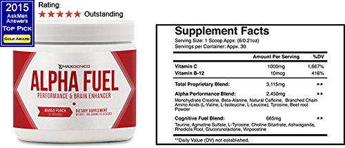 Studio : Maxgenics Publisher : Maxgenics Binding : Health and Beauty Product Description Most Americans are not getting the most out of their exercise or workouts as they should be. And it's no wonder. Most of us exercise tired in the early morning not having had a full 8-hour sleep or we work out in the early evening lacking in energy coming from a stressful and exhausting day at our jobs. We are busy people squeezing in a workout whenever we can with the time that we have. It's simply a necessity in the modern world that we live in. So we must give 100% during the precious time for exercise that we're lucky to find. Especially if we want to quickly achieve our target goals, whether that's losing however many inches of fat or building pounds of muscle. That's where MaxGenics Alpha Fuel comes in. Alpha Fuel is a powerful pre-workout supplement engineered to boost your body's energy levels so that you can give your workouts the utmost intensity it needs and deserves. With Alpha Fuel, you immediately feel an abundant reserve of energy to power you throughout your exercise. You'll also experience a huge surge in physical strength and mental focus, allowing you to add more sets or complete more reps in your workouts as needed. Alpha Fuel is strong enough to help you blast through your workouts like never before but gentle enough that it won't keep you up at night, preventing you from the sleep you need to actually benefit from the exercise you did during the day. If your workouts have been lacking in power or energy, or if you've been losing the focus and motivation you need to propel you to achieve your fitness goals, then MaxGenics Alpha Fuel is the solution you've been looking for. 0