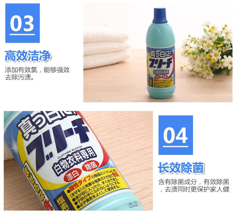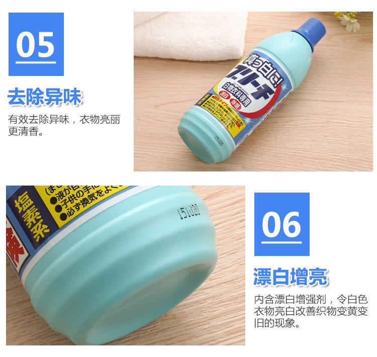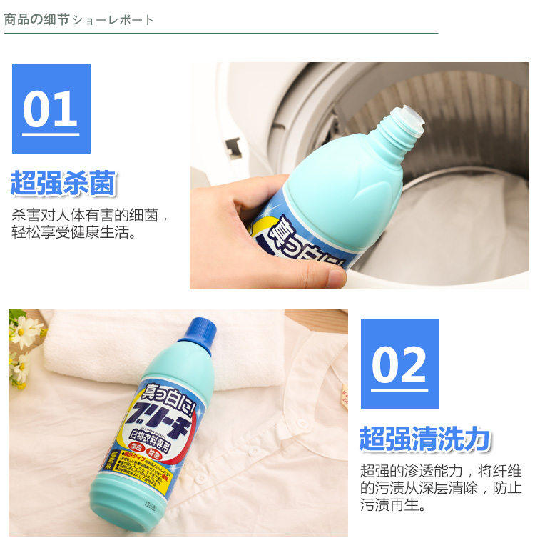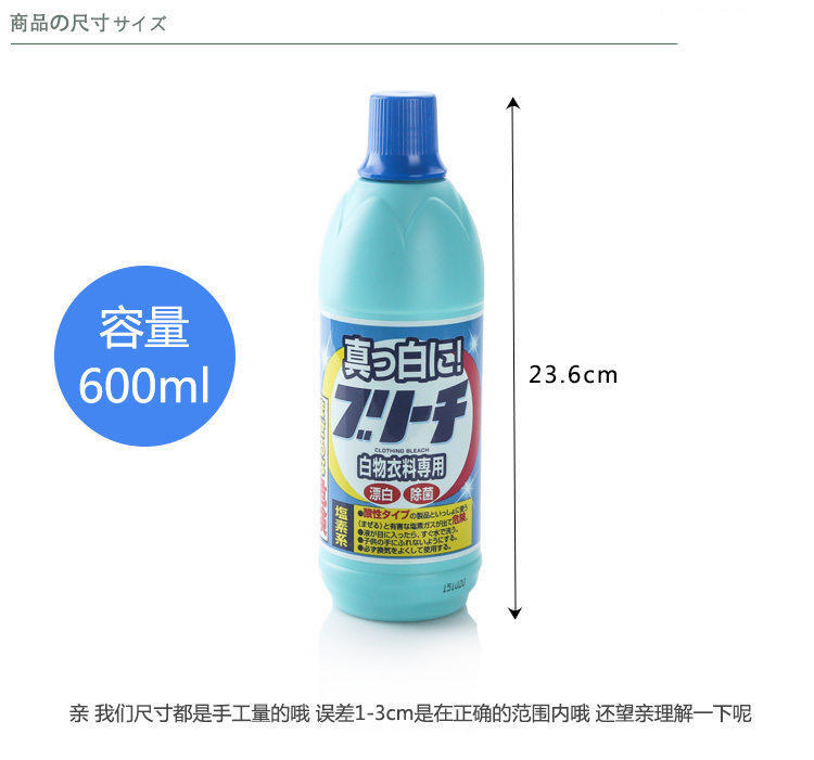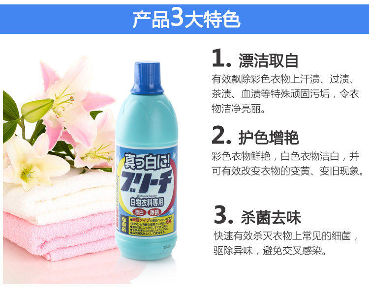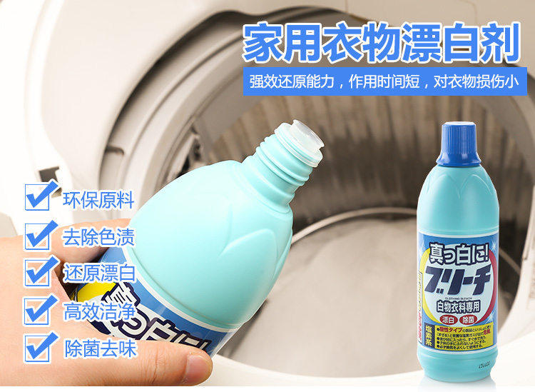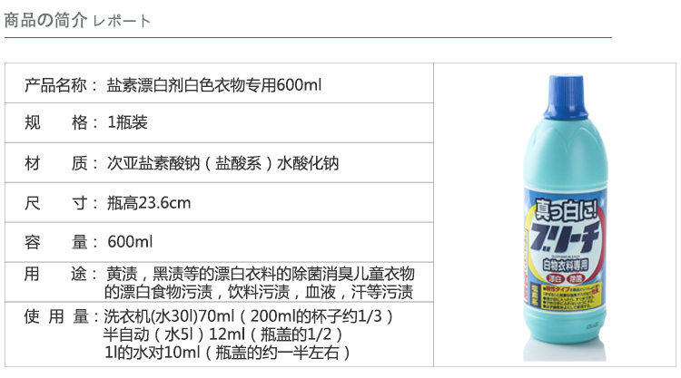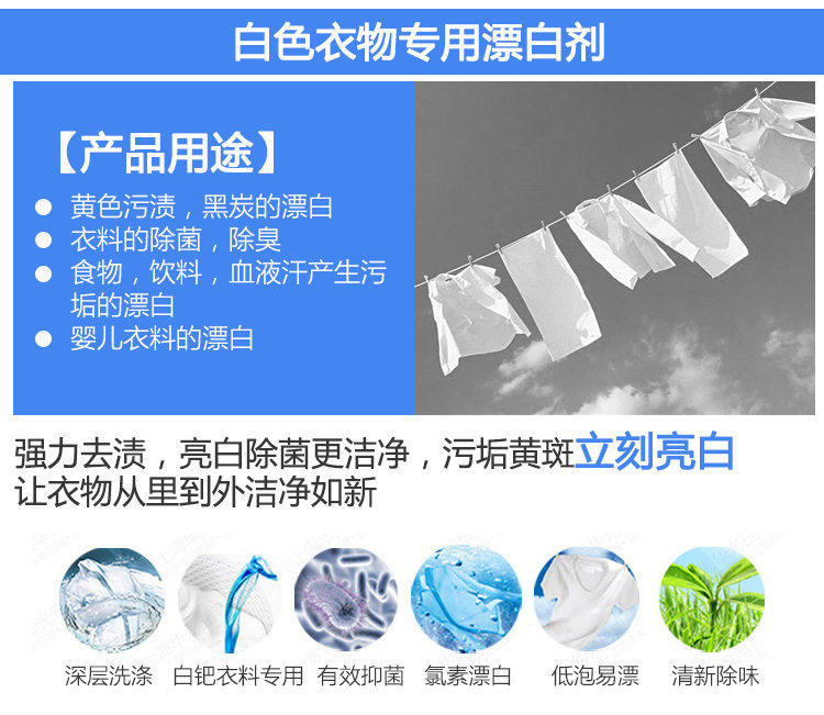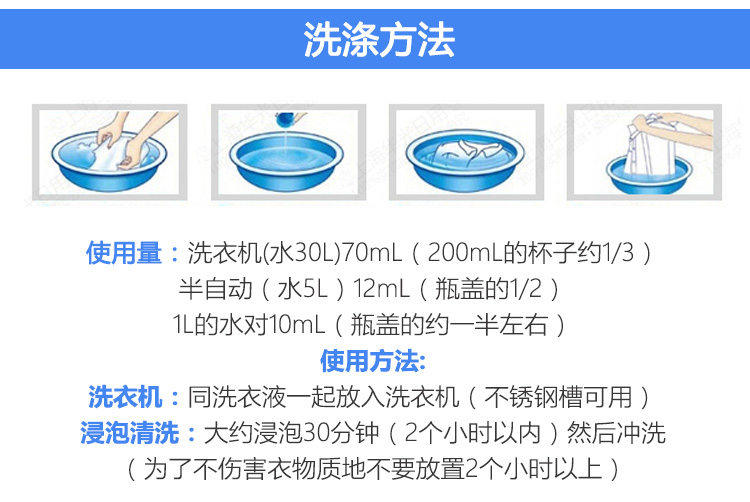 注意:只能用于白色棉麻制的衣物,自然发黄、霉斑、饮料血渍(尼龙、雪纺、蚕丝千万别用)衬衫和裙子使用要注意材质是否能用,去染色可以尝试50-70度的水温不保证一定可以漂白。