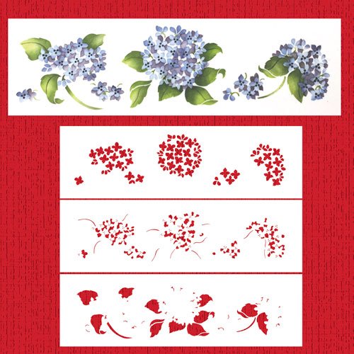 Studio : Designer Stencils Publisher : Designer Stencils Binding : Kitchen Product Description Do you want the look of hand-painted hydrangea flowers, yet you can only draw stick figures? Use our multi-layer stencil set to get a hand-painted effect. Starting with part one, you build up the parts of the flower using several shades of color for the petals and leaves. Use the triangle marks in the corners to "line-up" each overlay with the previous part (or use a permanent marker to outline parts of the pattern on the next piece of plastic for easier lining up of each overlay). Overall size of design is 3.2" high x 14" wide with each cluster approx. 3.5" x 4.8". Laser cut from durable, 10 mil food grade plastic for repeated use. 0