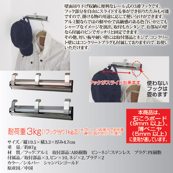 ●壁面吊り下げ収納に便利なレール式の3連フックです。