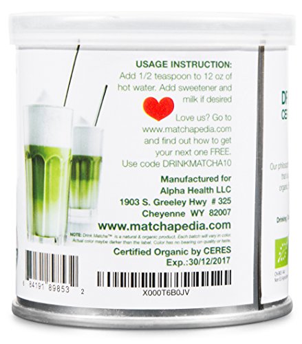 -. Brand : DRINK MATCHA -. Feature : 100% USDA ORGANIC - Certified Orgnic to USDA and EU standards / LAB TESTED FOR PURITY - DRINK MATCHA is lab tested for Lead and heavy metals to ensure you get the purest product possible. Ask other brands to see if they test for heavy metals. / GREEN SUPERFOOD - Rich in Antioxidants and EGCG's - Matcha is a natural superfood / GREAT FOR TEA, LATTES, & SMOOTHIES - Use Drink Matcah as a tea or make deliciouls lattes with it. Also great in smoothies and in baked goods and even ice cream! / 100% MONEY BACK GUARANTEE - We take your satisfaction seriously and back that with our 100% hassle-free money back guarantee -. Label : Alpha Health -. Manufacturer : Alpha Health -. Model : Organic Matcha Green Tea -. MPN : Organic Matcha Green Tea -. PartNumber : Organic Matcha Green Tea -. ProductGroup : Kitchen -. ProductTypeName : KITCHEN -. Publisher : Alpha Health -. Studio : Alpha Health -. Title : Drink Matcha - Matcha Green Tea Powder - USDA Organic - 100% Pure Matcha Green tea Powder - Nothing added