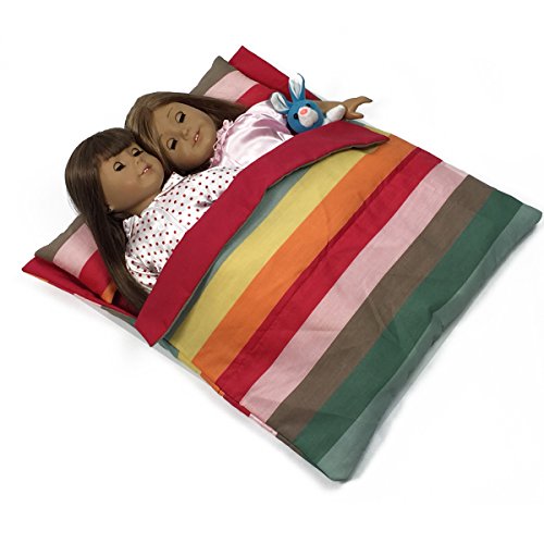 -. Binding : Toy -. Brand : The New York Doll Collection -. EAN : 0687077260935 -. Feature : This adorable striped doll-sized sleeping bag is perfect for an overnight adventure with 2 of your 18" dolls / Multi colored stripes cover this adorable 18 Inch doll sleeping bag for fun dolly sleepovers! / Doll Sleepover bag is sized to fit 15 Inch dolls like Bitty Baby® or 18 Inch dolls like American Girl® / Cuddly Sleeping Bag can be reversed to show the solid color bag. Matching Pillows are reversible too! / Exclusively made by The New York Doll Collection, offering the highest quality 18" Doll Furniture, 18" Doll Clothes, 18" Doll Shoes & 18" Doll Accessories! -. IsAdultProduct : 0 -. Label : The New York Doll Collection -. Manufacturer : The New York Doll Collection -. MPN : LYSB00WKNF3O8-TOYS -. PackageQuantity : 1 -. PartNumber : LYSB00WKNF3O8-TOYS -. ProductGroup : Toy -. ProductTypeName : TOYS_AND_GAMES -. Publisher : The New York Doll Collection -. Studio : The New York Doll Collection -. Title : Doll Bedding Striped Pattern Reversible Twin Doll Sleepover Bag for 18" Dolls - Fits 2 18 Inch Dolls - Doll Sleepover Bag for Twin Dolls - 18 Inch Doll Bedding - 18 Inch Doll Sleeping Bag -. UPC : 687077260935