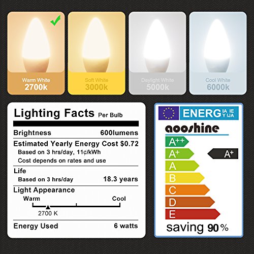 Studio : Aooshine Publisher : Aooshine Product Description ▶Specifications ?Brand: Aooshine ?Base Type: E12 ?Dimmable: No ?Power: 6W ?Lumen: 600 LM ?Voltage: AC 85-265V ?Beam angle: 210 degree ?Material: PC ?Light color: Soft White, 2700K ?Size: diameter 1.4'; height 4.1'(check the second picture for size details) ?Pakage Includes: 6x 6 Watts led candelabra bulb