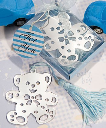 - Lovable teddy bear bookmark favor, from Fashioncraft's exclusive Book Lovers Collection, measures 5.5" including tassel, silver teddy page marker charm, enhanced with cutout details for face, paws and bow, topped with an attached baby blue cloth tassel