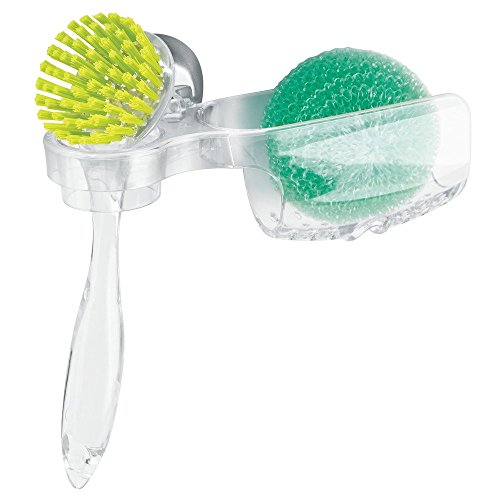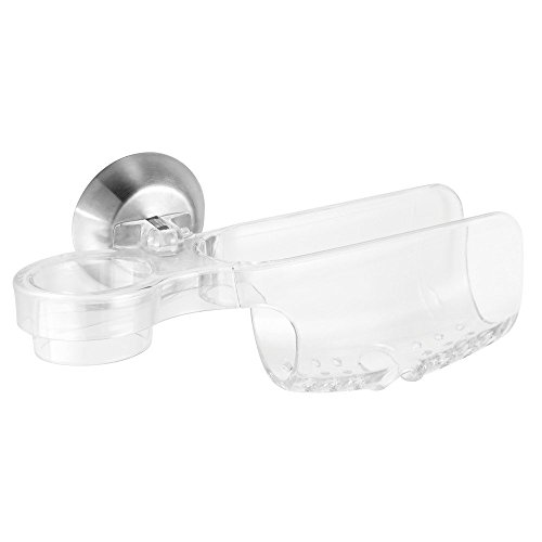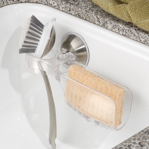 InterDesign Forma Power Lock Kitchen Sink Suction Holder for Sponges, Soap with Scrub Brush Holder - Clear/Brushed Stainless Steel