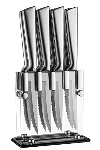 - TOP COUNTER SPACE SAVER: Opt for neat organization of 8 STAINLESS STEEL Steak Knives and free your kitchen countertop with premium Classy Knives cutlery set with stand! Made of clear acrylic, this elegant kitchen knife block is coming to upgrade your kitchen décor!