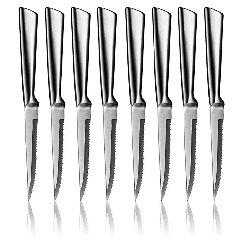 - UNIQUE BLEND OF STYLE & SAFETY: Made of ONE-PIECE Stainless Steel to prevent handles from falling off and with a SERRATED blade of 4.5”, our Steak Knives are guaranteed long-lasting, a MUST-HAVE for any professional or home cook. Dishwasher safe. hand wash recommended