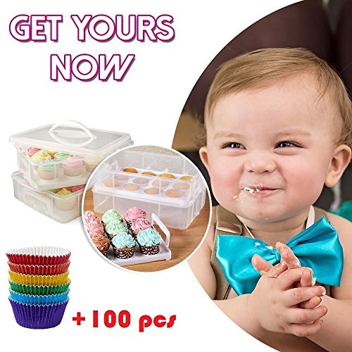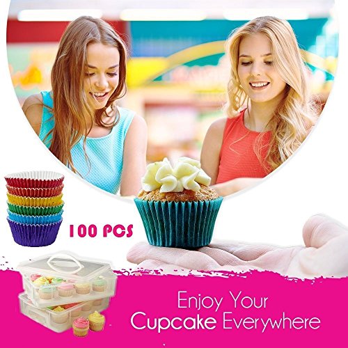 Cake Carrier | Multifunctional 2 Tier Container Holder Caddy Storage Holds 24 Cupcakes Cookies Muffins 2 Large Cakes with Handle and 100 pcs Paper Baking Cup | Non Toxic PP Material | 1239