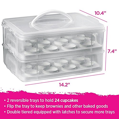 --- Compact Design Holds 24 Counts --- The storage is double-tiered and equipped with latches to secure more trays when needed. You’ll also get 2 insert trays that holds 24 cakes in their 2.16 inch diameter organizer cups.