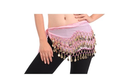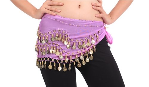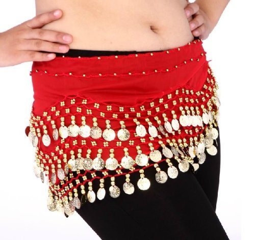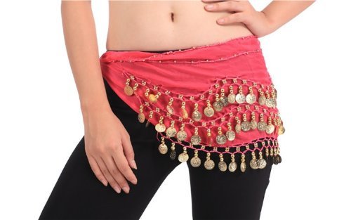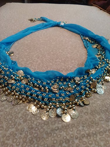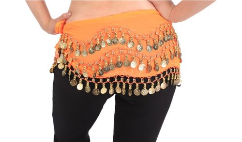 Color: available in black, white, red, yellow, hot pink, pink, green, purple, light purple, sky blue, royal blue and orange (12 color you choose) Fabric: chiffon Length: 63" (across the top including ties) Width: 8.2" drop (fabric) 10.5" (with coins) Decorated Part: 31.5" Number of Gold Coins: 98 coinsFeature