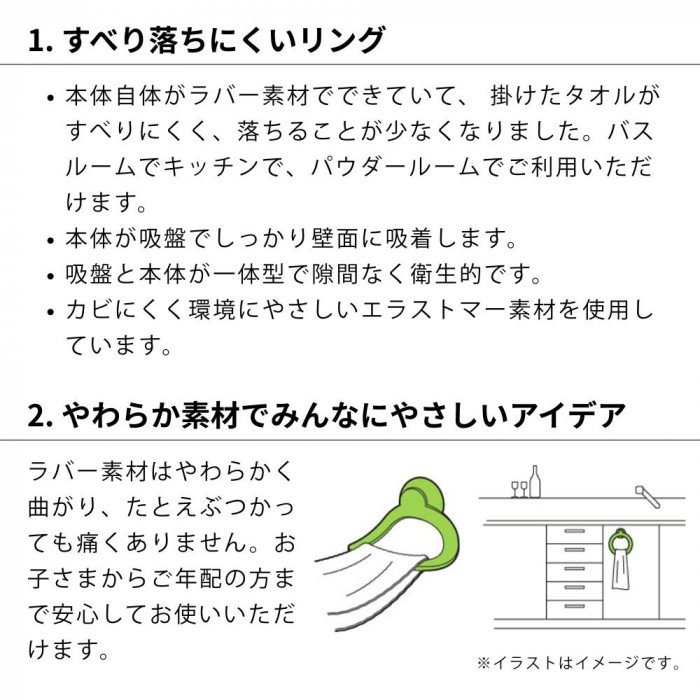 滑り落ちにくいラバー素材で作られた、優しくやわらかに曲がるタオルリングです。バス・キッチン・パウダールームに。吸盤と本体が一体型なので隙間がなく衛生的です。 |
