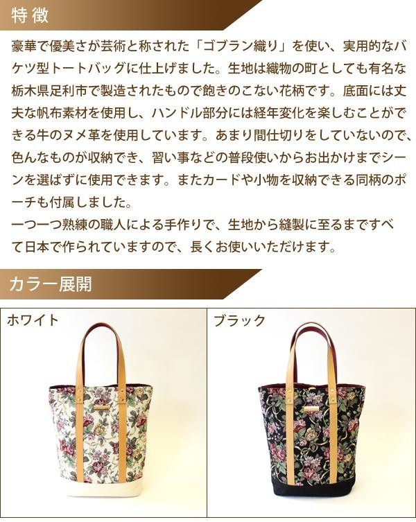 | 豪華で優美さが芸術と称された「ゴブラン織り」を使い、実用的なバケツ型トートバッグに仕上げました。底面には丈夫な帆布素材を使用し、ハンドル部分には経年変化を楽しむことができる牛のヌメ革を使用しています。またカードや小物を収納できる同柄のポーチも付属します。一つ一つ熟練の職人による手作りで、生地から縫製に至るまですべて日本で作られています。 |