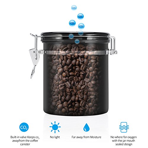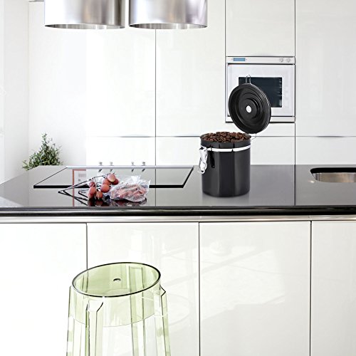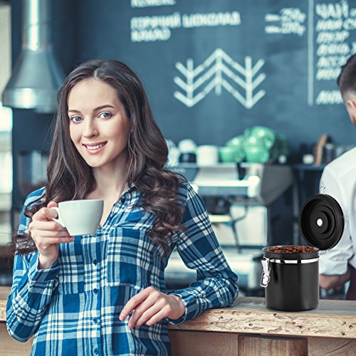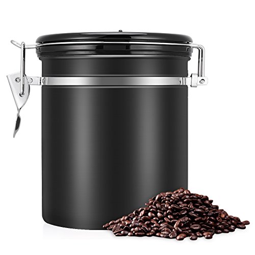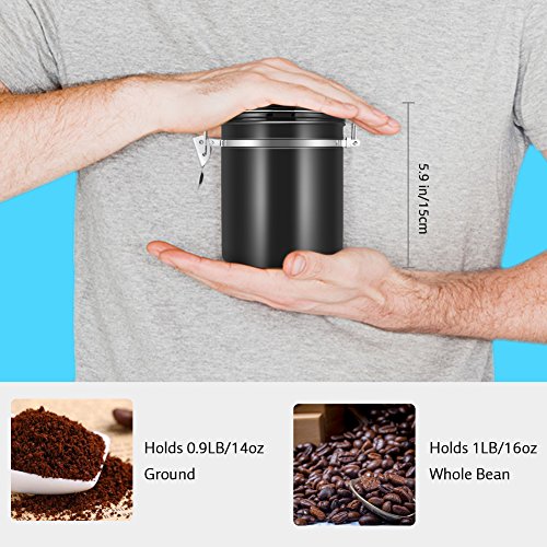 Coffee Container Airtight for Ground or Whole Beans Stainless Steel Vacuum Sealed Black Kitchen Storage Canister (16oz)