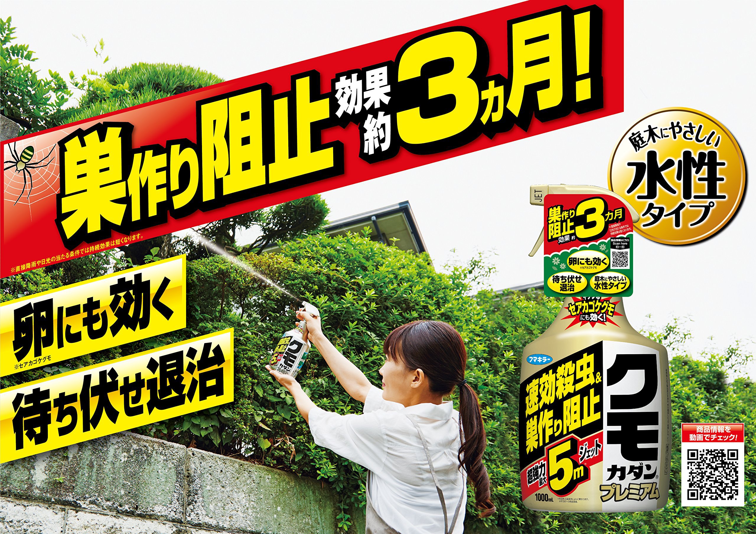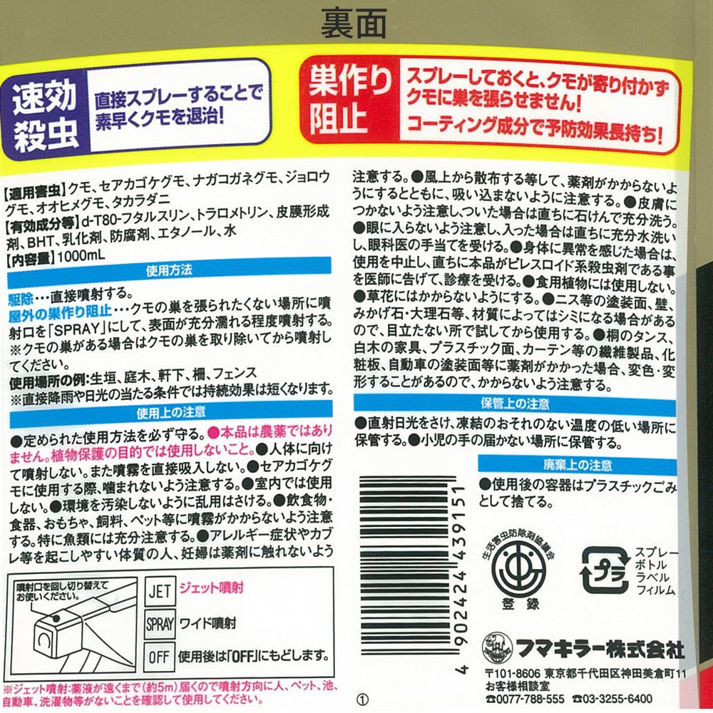 Also, if the spider is sprayed in the place where the nest is likely to be stretched, the residual repellent ingredient <tralomethrin> and the coating ingredients demonstrate excellent preventive effect.