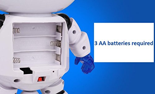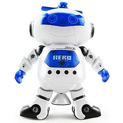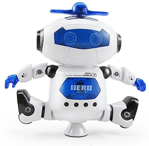 The danceing robot has ancing action, arms and legs move with the song, 360 degree spinning action. Moves and rotates with its legs and cool wheel and side steps to the beat rotates with its middle leg