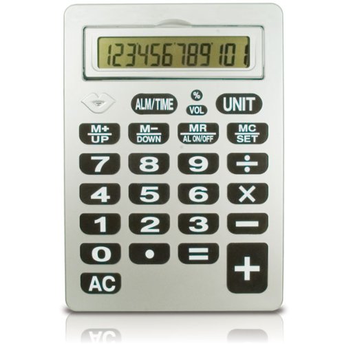 -. Feature : Hear keys pressed & calculation results spoken / Easy-to-see big keys and 7/8" digits on LCD / Calculator measures 8.25" x 11.50" / Time display & alarm with beep or 3 melodies / Uses 2 AAA batteries (not included)
