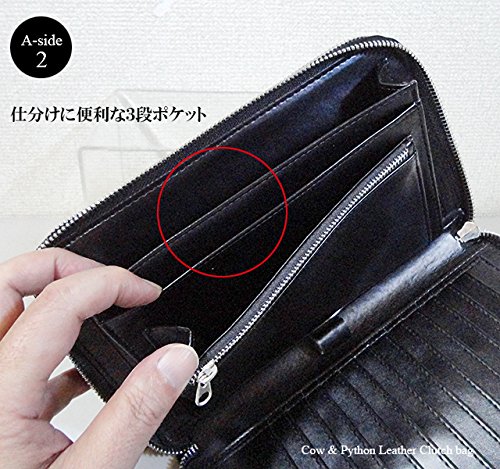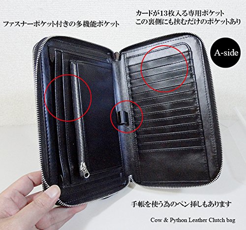 -. Feature : 大きさ:[タテ] 14cm [ヨコ] 22cm [厚さ] 4cm / ポケット数:[カード]×29 [札入れ]×2 [小銭]×1 [他]×6 / 素材:[表]牛革・蛇革 [中]牛革・合成皮革 / パイソン革部分は、ひとつひとつ柄の出方が違います。
