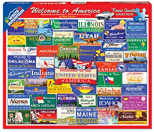 -. Binding : Toy -. Brand : White Mountain Puzzles -. Department : Travel Posters -. EAN : 0724819257874 -. Feature : This collection of road signs bid you a warm welcome to all 50 states / Artist Mark Karvon is a native of Chicago with a background in mechanical drawing and architectural design, which led to his career in painting and illustration / Every White Mountain Puzzle is proudly manufactured in America with a 100% customer satisfaction guarantee / All our puzzles contain unique interlocking pieces that are made of sturdy blue chipboard on recycled paper / 1000 piece puzzles measure 24"x30" - larger pieces for easy handling -. IsAdultProduct : 0 -. ItemPartNumber : 1145 -. Label : White Mountain Puzzles, Inc. -. Manufacturer : White Mountain Puzzles, Inc. -. Model : 1145 -. MPN : 1145 -. NumberOfItems : 1 -. PackageQuantity : 1 -. PartNumber : 1145 -. ProductGroup : Toy -. ProductTypeName : TOYS_AND_GAMES -. Publisher : White Mountain Puzzles, Inc. -. Studio : White Mountain Puzzles, Inc. -. Title : White Mountain Puzzles Welcome to America - 1000 Piece Jigsaw Puzzle -. UPC : 724819257874 -. Warranty : No Warranty