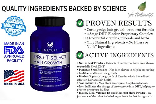 Vie Naturelle's Pro-T Select Hair Growth Supplement has been meticulously formulated to work as a complete inside out nourishment to support proper follicular function. Each ingredient is strictly backed by scientific studies to ensure optimal results.With our unique blend of essential vitamins, herbs, and minerals this cutting edge hair loss product will help address various deficiencies that have been known to cause hair loss in men and women of all ages.