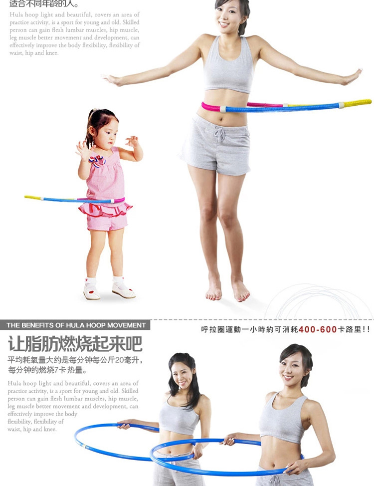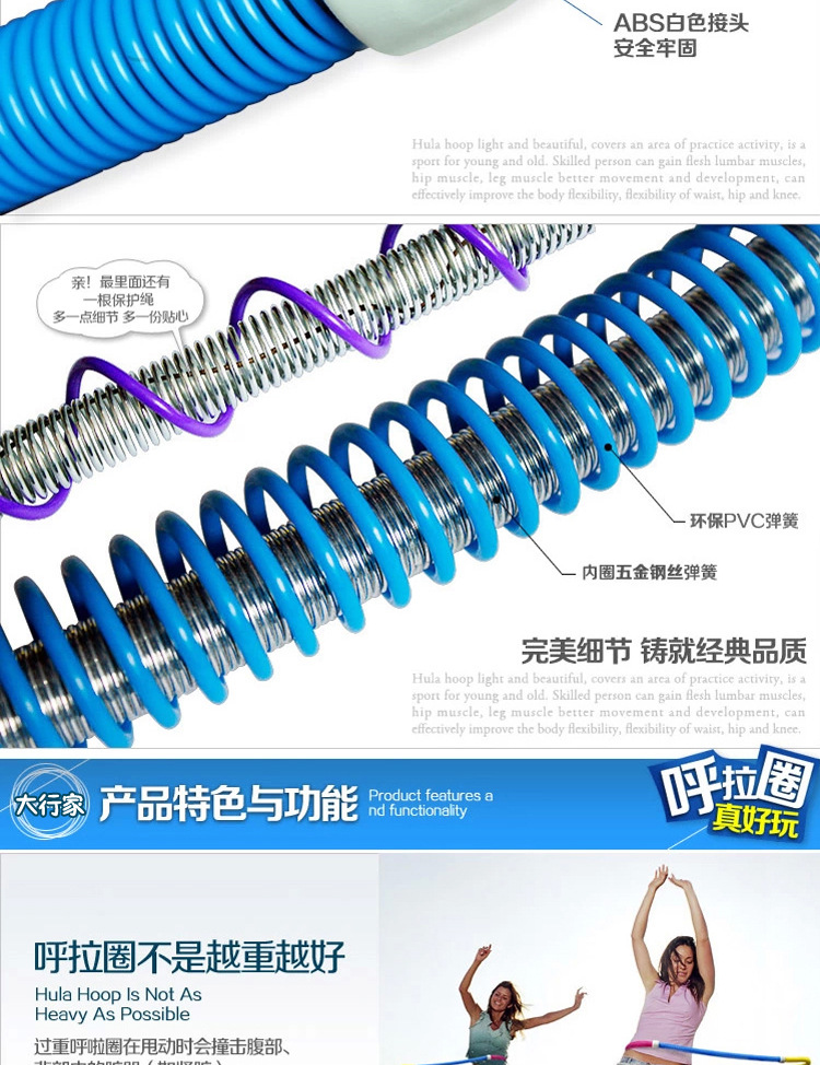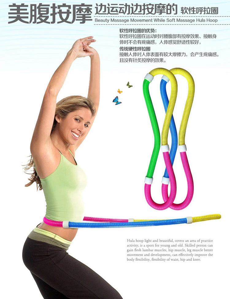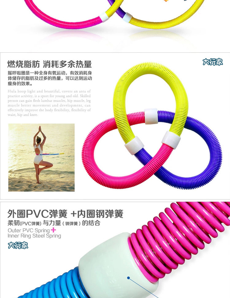 Its outer ring is composed of PVC spring, enhanced the flexibility of the spring, the inner ring is composed of steel spring, enhanced her strength, through the body coordination movement to promote the hula hoop rotation, can squeeze the abdomen,Play a peculiar effect on weight loss.This hula hoop is not only a significant function of weight loss, and is said to have a similar effect of massage, short term can improve back pain and indigestion problems.