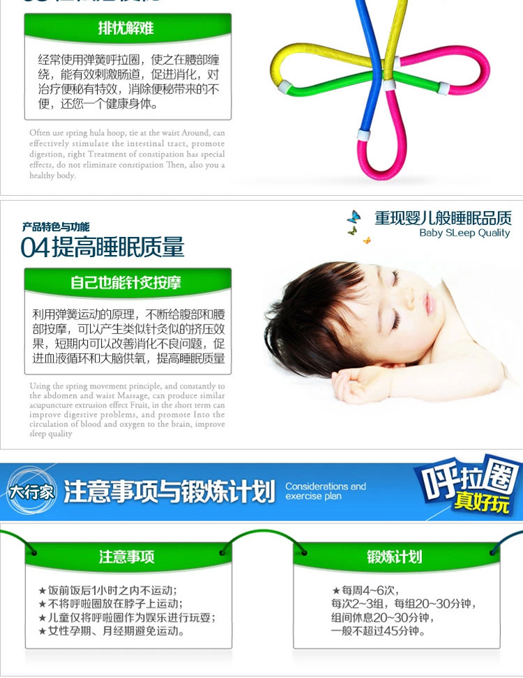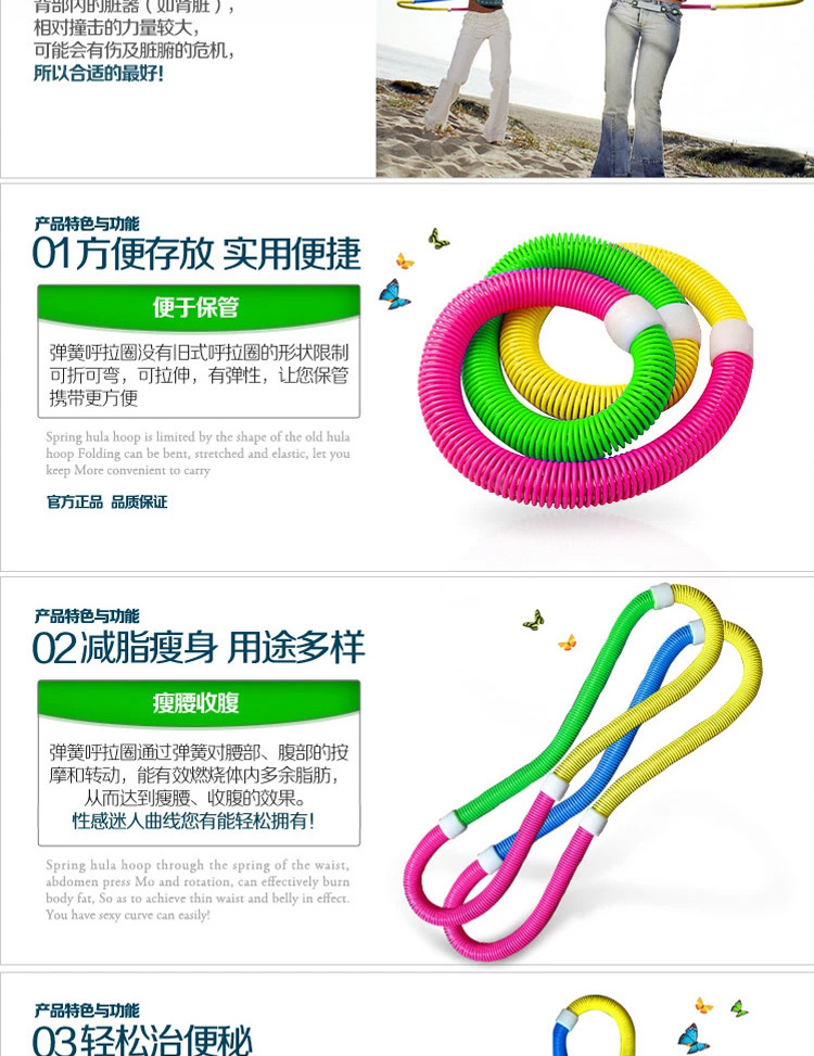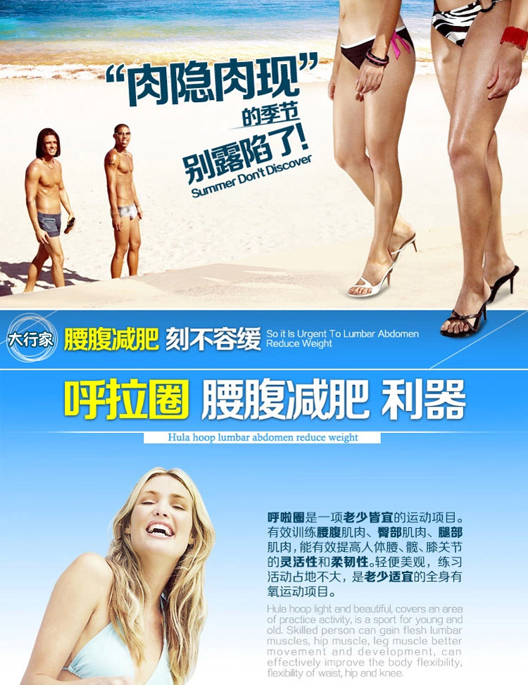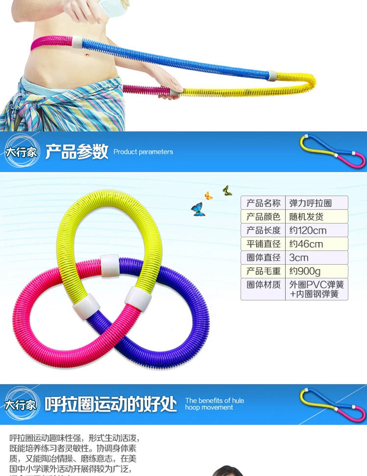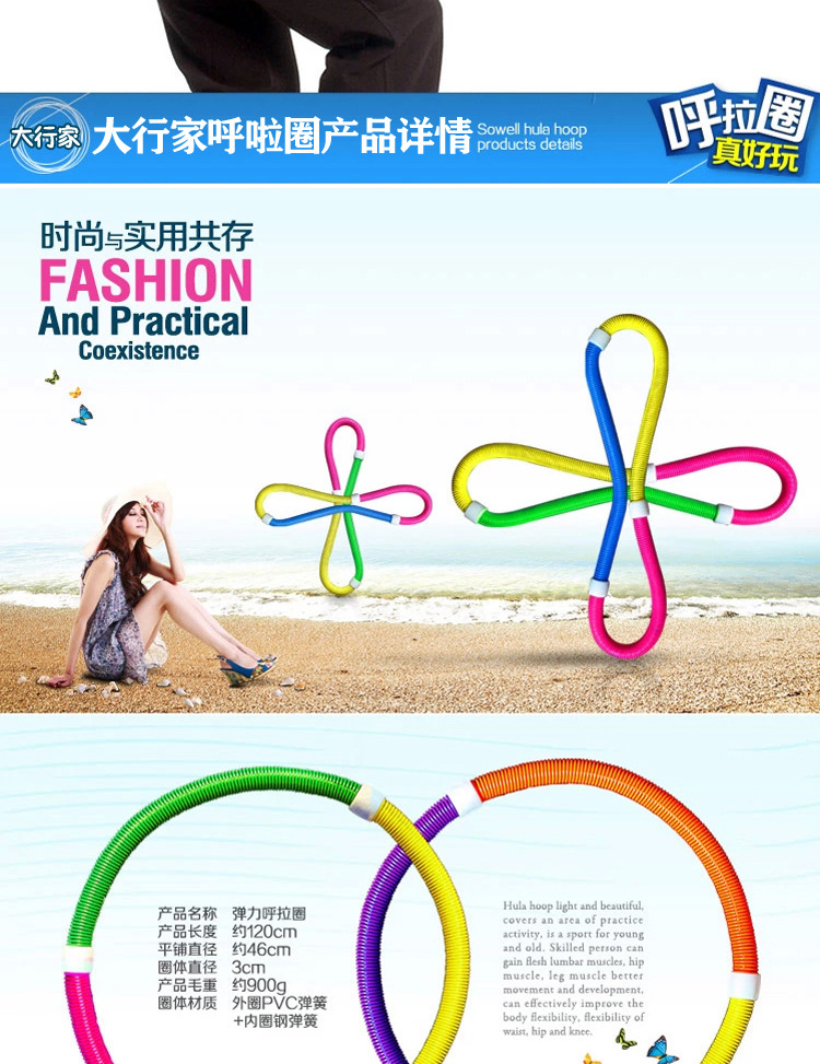 Its outer ring is composed of PVC spring, enhanced the flexibility of the spring, the inner ring is composed of steel spring, enhanced her strength, through the body coordination movement to promote the hula hoop rotation, can squeeze the abdomen,Play a peculiar effect on weight loss.This hula hoop is not only a significant function of weight loss, and is said to have a similar effect of massage, short term can improve back pain and indigestion problems.