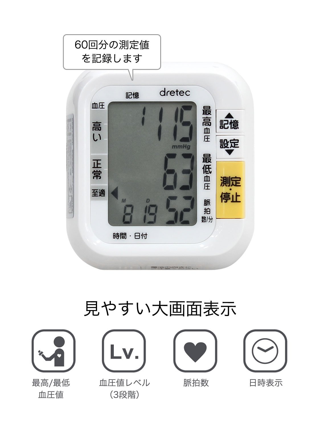 Maximum / diastolic blood pressure and pulse rate can be measured.