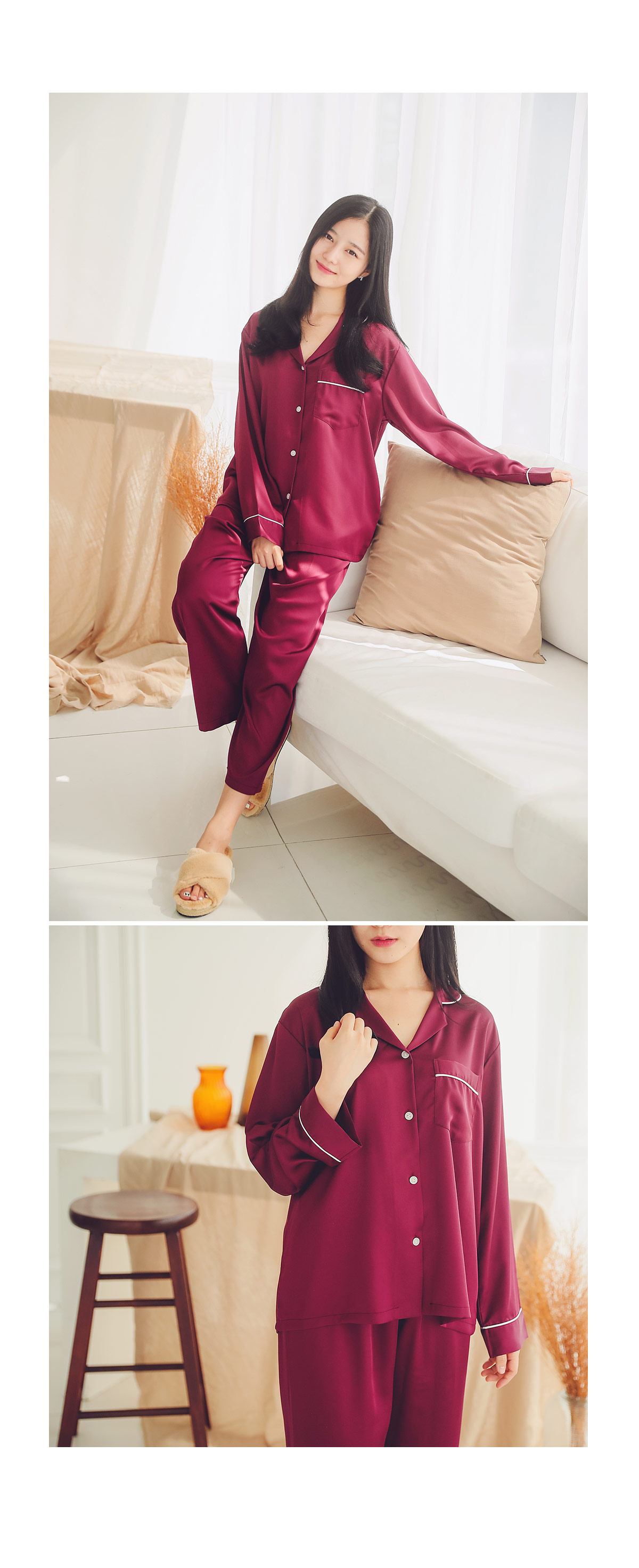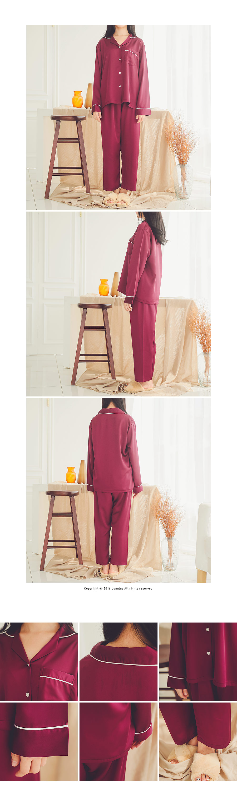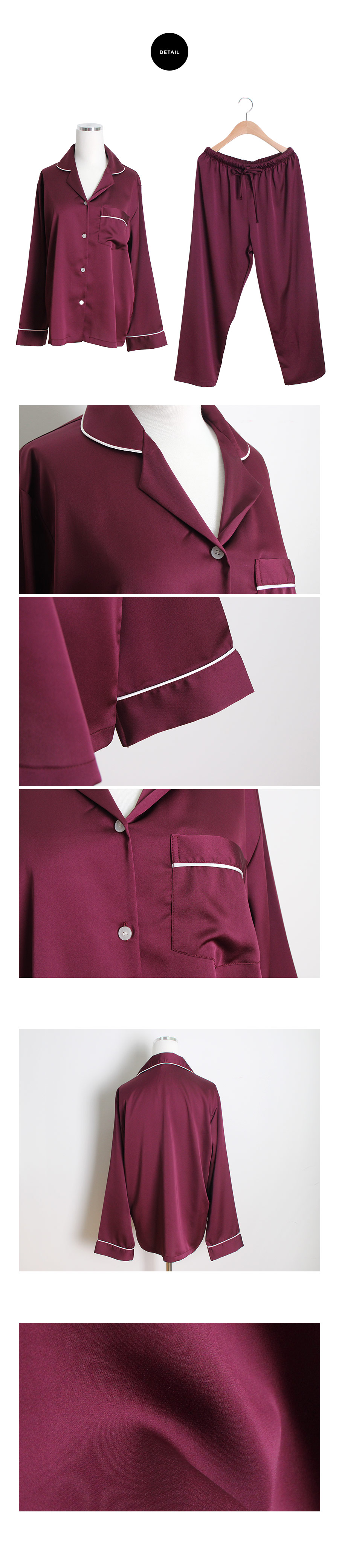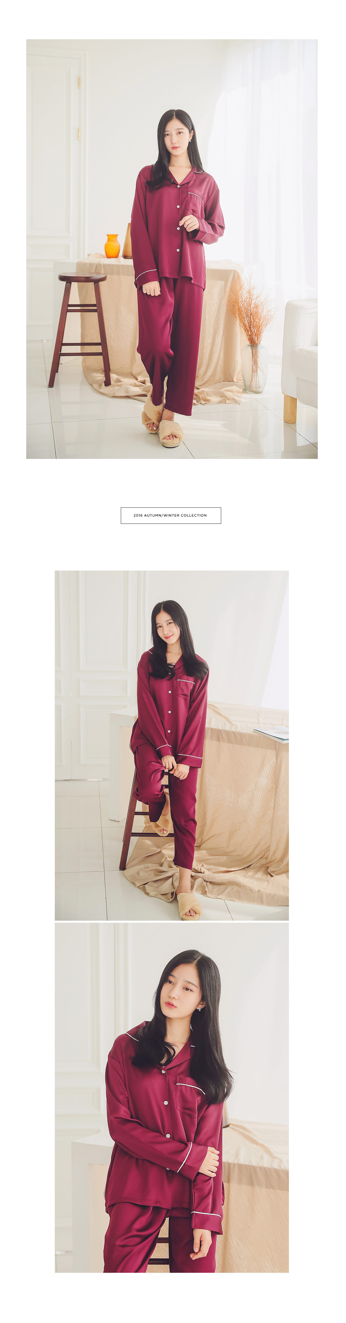 드라이한 원단 위에 고급스러운 초코렛 컬러의 조화가 세련되어 보이는 파이핑 잠옷이에요 : ) 트렌디한 파이핑 디자인으로 카라 끝 부분 소매 끝부분 그리고 포켓에 달아주어 깔끔하게 포인트를 주었어요.^^ 유광이 아닌 무광톤의 드라이한 원단으로 은은한 광택이 도는 잠옷이랍니다. 사이즈를 살짝 줄여 66까지 커버 될 수 있도록 제작하였고요. 슬림하면서 살짝 핏되어지는 패턴으로 나왔습니다. A/W에 딱 맞는 컬러감으로 고급스러우면서 트렌디하게 입으실 수 있습니다. 가벼우면서 피부에 닿는 느낌이 좋아 숙면을 취하시기 좋습니다. 100%국내 생산으로 내구성이 좋고, 퀄리티가 높습니다.