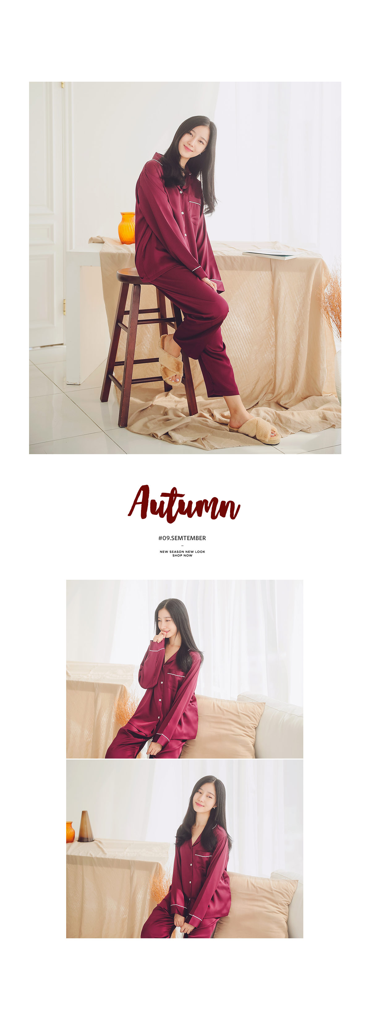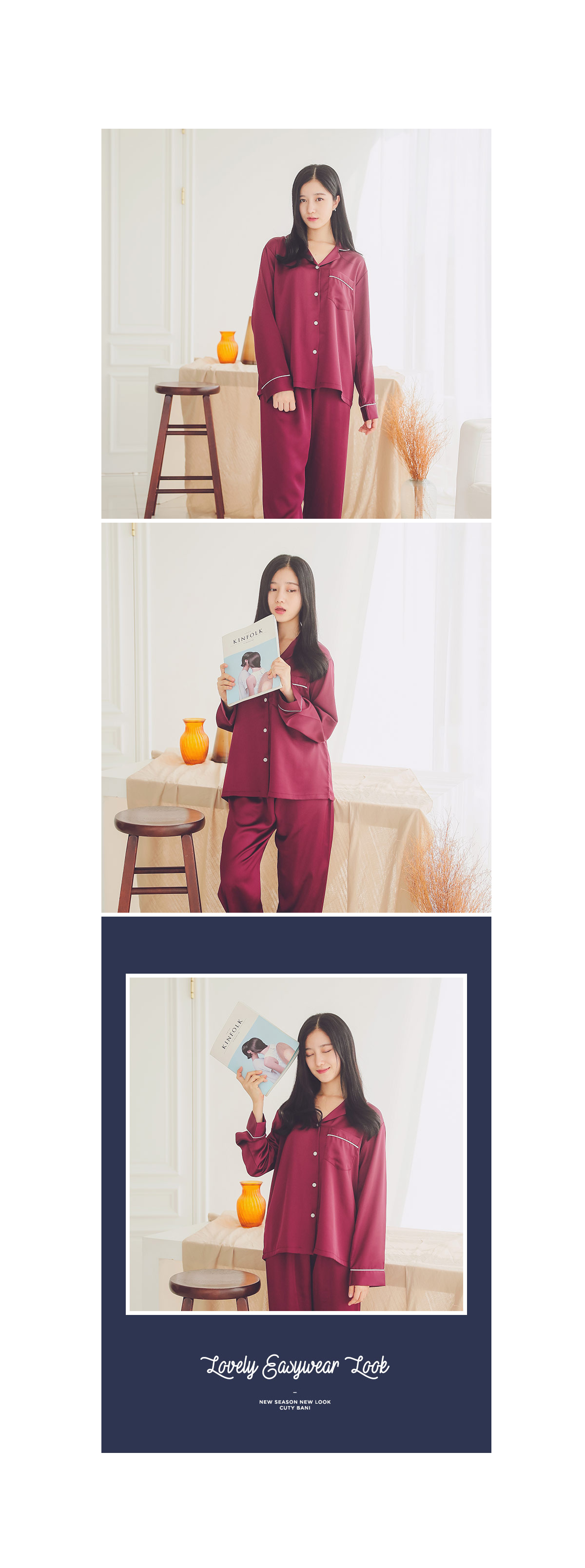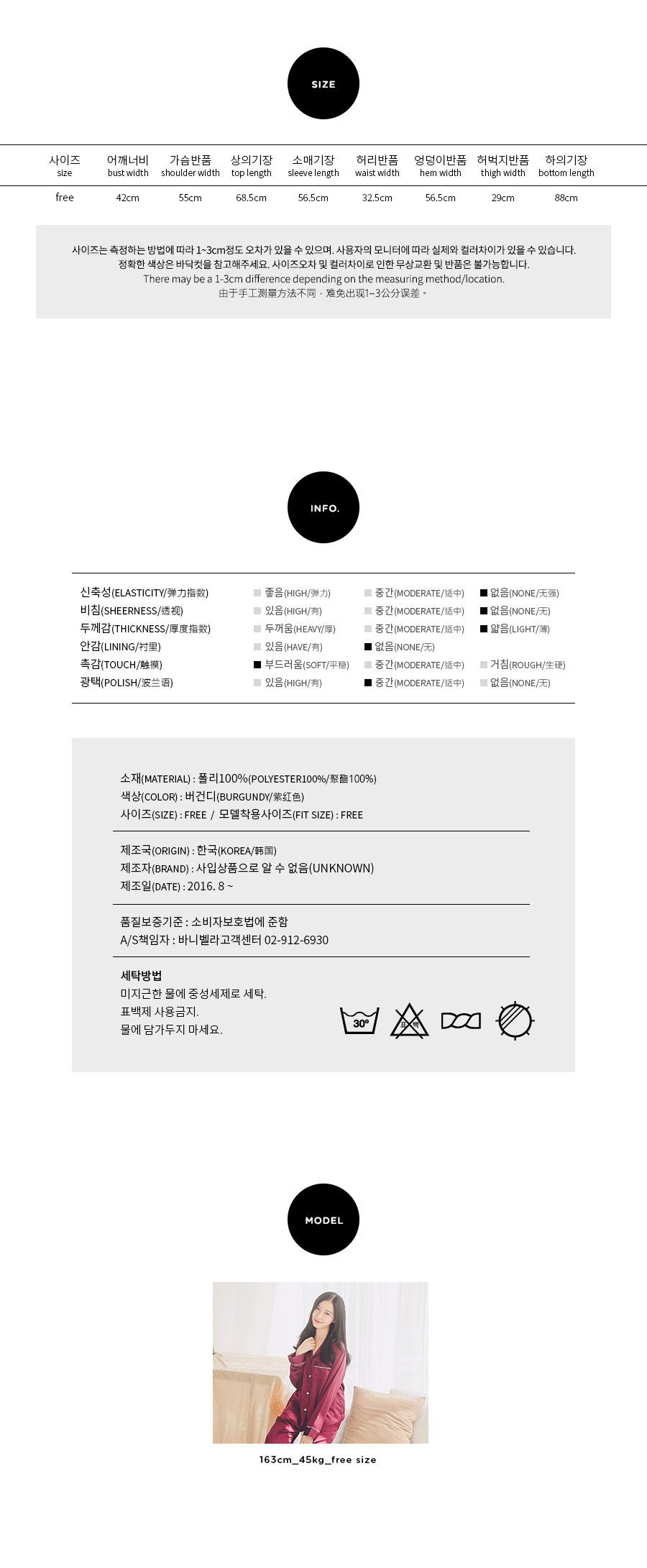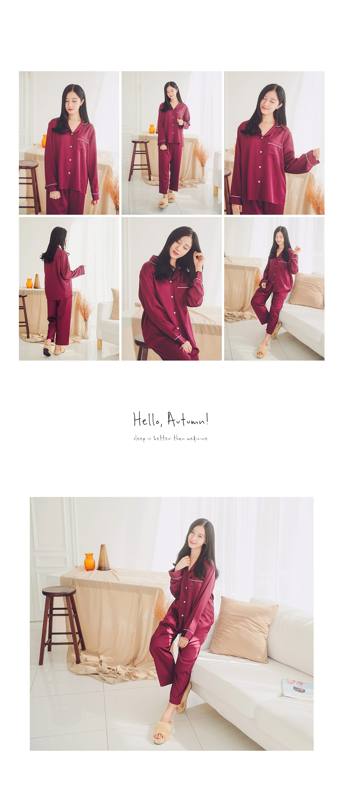 드라이한 원단 위에 고급스러운 초코렛 컬러의 조화가 세련되어 보이는 파이핑 잠옷이에요 : ) 트렌디한 파이핑 디자인으로 카라 끝 부분 소매 끝부분 그리고 포켓에 달아주어 깔끔하게 포인트를 주었어요.^^ 유광이 아닌 무광톤의 드라이한 원단으로 은은한 광택이 도는 잠옷이랍니다. 사이즈를 살짝 줄여 66까지 커버 될 수 있도록 제작하였고요. 슬림하면서 살짝 핏되어지는 패턴으로 나왔습니다. A/W에 딱 맞는 컬러감으로 고급스러우면서 트렌디하게 입으실 수 있습니다. 가벼우면서 피부에 닿는 느낌이 좋아 숙면을 취하시기 좋습니다. 100%국내 생산으로 내구성이 좋고, 퀄리티가 높습니다.