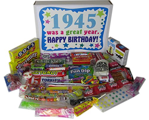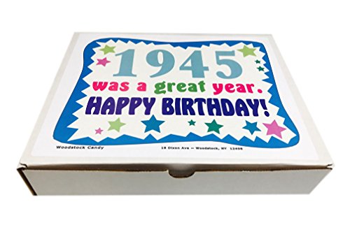 -. Binding : Misc. -. Brand : Woodstock Candy -. Feature : SurP.R.Ise a 72 year old with candy from their past / Filled with forty kinds of retro nostalgic candy / Makes a fun and unique 72nd birthday gift for someone born in 1945 / Everyone loves candy from their youth / Box reads "1945 was a Great Year. Happy Birthday!" -. IsAdultProduct : 0 -. Label : Woodstock Candy -. Manufacturer : Woodstock Candy -. PackageQuantity : 1 -. ProductGroup : Grocery -. ProductTypeName : GROCERY -. Publisher : Woodstock Candy -. Studio : Woodstock Candy -. Title : 72nd Birthday Gift Box of Retro Nostalgic Candy from Childhood for a 72 Year Old Man or Woman Born in 1945