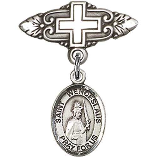 -. Title : Sterling Silver Baby Badge with St. Wenceslaus Charm and Badge Pin with Cross 1 X 3/4 inches