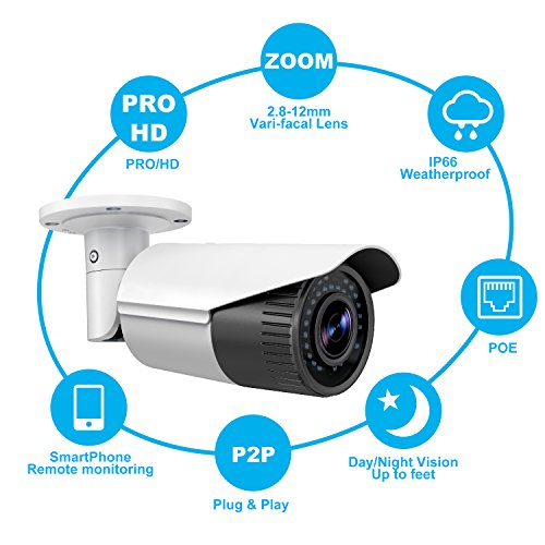 Motorized 2.8~12mm lens. A motorized varifocal lens grants you the ability to customize your viewing area (and focus) remotely. Zoom all the way into 33° angle to view a small area with astonishing detail, or zoom all the way out to 93° angle to survey a larger sample of the environment. Make these adjustments easily with your NVR or a connected mobile device.